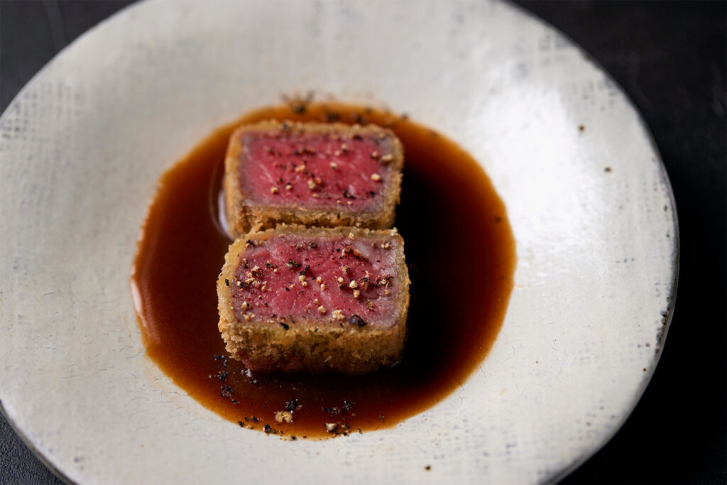 いつ訪れても新しい体験が待つ『北大路倶楽部』のカウンターには、和食の様式にしばられず、自由な発想で繰り出される多彩なメニューが並びます。第1弾は、石垣牛を使った肉割烹です。手作りウスターソースと合わせた和牛ヒレカツや貝出汁で食べる和牛そうめん、牡丹海老とともに味わう和牛手巻きなど、遊び心を大事に手間暇かけたメニューを小皿で少しずつ提供するおまかせ肉割烹コース(16,500円/税込)をご提供します。石垣牛は年間750頭しか出荷されず、そのほとんどが島内で消費される希少なブランド牛。温かな気候でストレスなく育った牛は上質で風味豊かです。当社では、コロナ禍で観光客が減り石垣島の生産者が苦境に立たされた時に積極的に取扱いを開始した経緯から、需要が回復した今も安定的な仕入れが可能となっています。