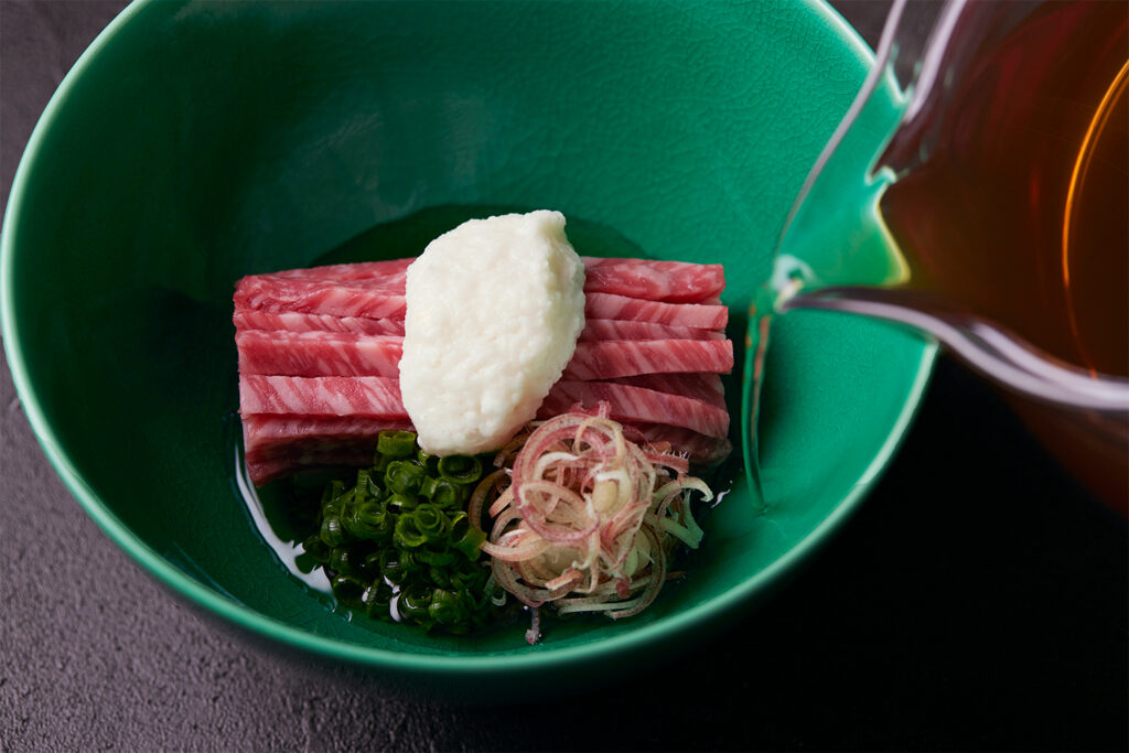 麺状にカットした石垣牛に、お肉とよく合うはまぐりの出汁を合わせた和牛そうめんです。よく絡めてお召し上がりください。